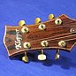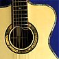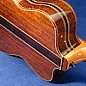 This is a 14-1/2 inch, 12-fret guitar made of old growth Brazilian rosewood and African blackwood, with a Swiss spruce top. The sides are multipiece with marquetry lines and inner sides of East Indian rosewood. The top purfling is paua abalone. The neck is mahogany, walnut, and curly maple, with bookmatched Brazilian rosewood headstock veneers, and an ebony fretboard and bridge. The rosette and end graft are buckeye burl. The binding is snakewood. It features double recurved sides, a sound port, and Klepper bracing.