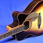 This 16-inch, 12-fret cutaway guitar, with recurved bass side and double sides (inner side of walnut), has ziricote back and sides with a back centerpiece of ebony. The top is red spruce with a dark sunburst finish. There is a multi-centered rosette of redwood burl and a redwood burl end graft. The neck is mahogany, walnut and curly maple, with bookmatched ziricote headstock veneers, and pearl purfling on the headstock face. The fretboard and bridge are ebony, and the binding is cocobolo. It has a sound port and Klepper bracing.